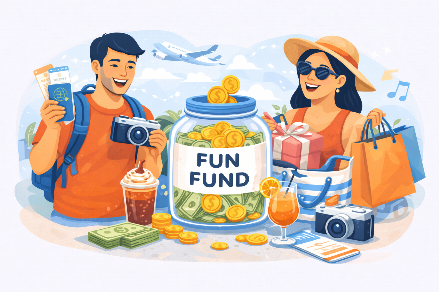 Stylized flat illustration of a couple enjoying travel and shopping, representing a guilt-free fun fund for budgeting life’s small luxuries
